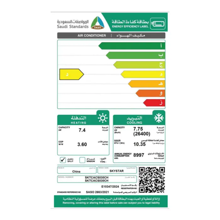 جودة الخامات والتصنيع من أبرز ما يميز مكيف اسبليت سكاي ستار 26400 وحدة. الهيكل الخارجي للمكيف مصنوع من مواد مقاومة للصدأ وعوامل الطقس، أما المكونات الداخلية فتتميّز بالمتانة والكفاءة العالية، ما يضمن أداء مستقراً وعمر استخدام طويل حتى مع الاستخدام المكثف.