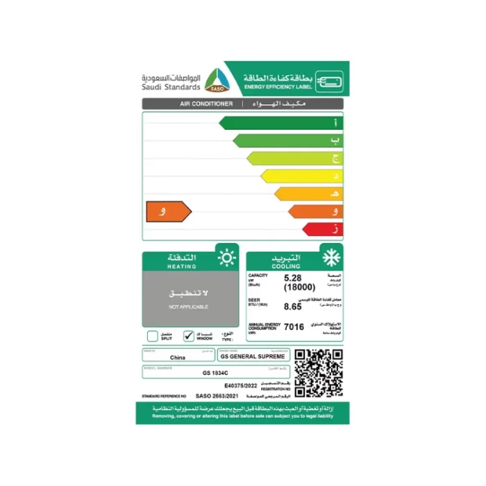 مكيف جنرال سوبريم شباك 18000 وحدة تيربو – بارد GS1834c